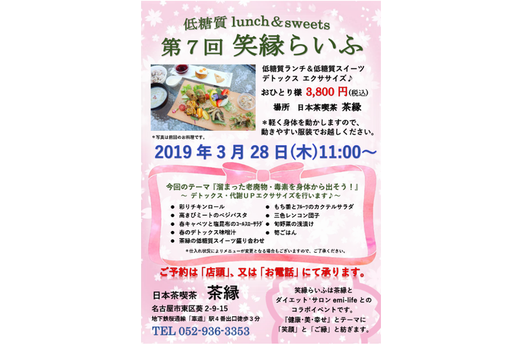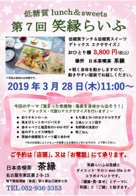 【イベント案内】”老廃物・毒素を出し切ろう!!” 第7回「笑縁らいふ」低糖質”デトックス”ランチ&代謝アップエクササイズ♪
