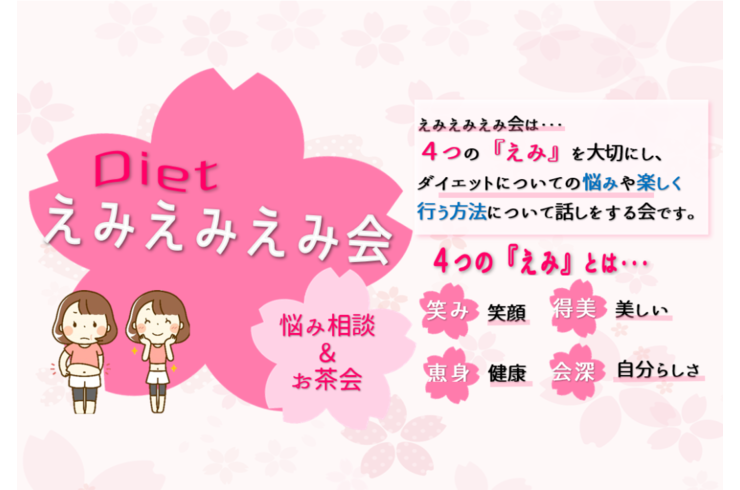 えみえみえみ会とは、4つの『えみ』を大切にし、ダイエットについて悩みや楽しく行う方法について話をする会です。